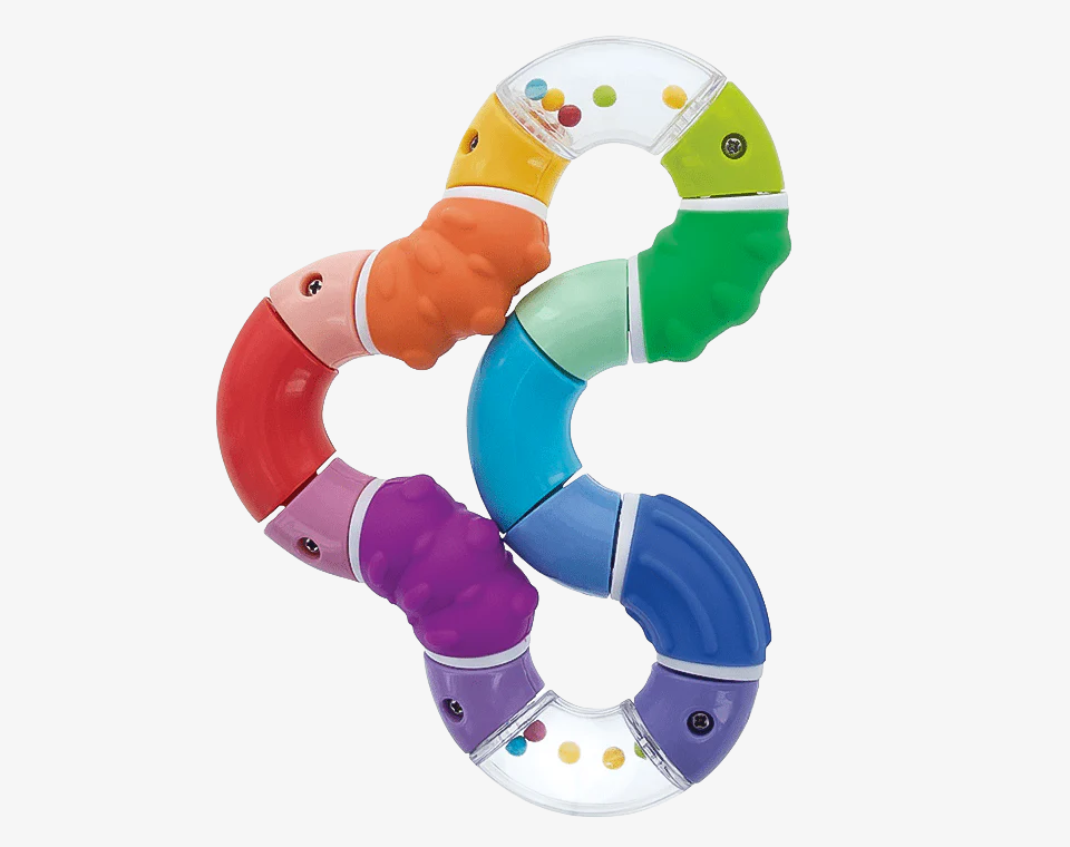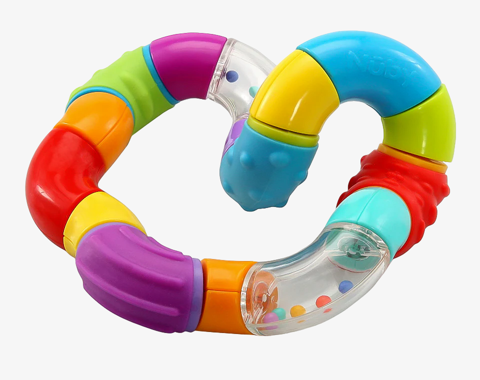 נשכן רעשן מתפתל מסייע בפיתוח מוטוריקה עדינה בעל משטחים מרובים המסייעים בבקיעת השיניים.
