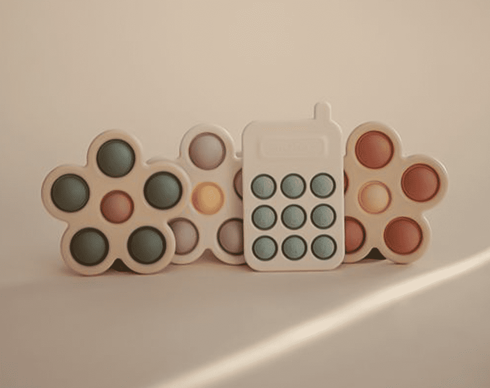 צעצוע לחיצה בצורת פרח מבית מושי מיוצר תוך התחשבות בידיים קטנות מעודד חקר חושי ופיתוח מיומנות מוטוריקה עדינה עם עיצוב נקי וקלאסי בצבעים רכים