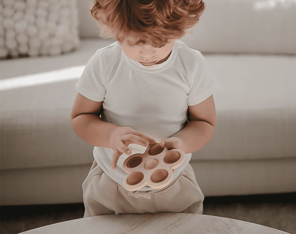צעצוע לחיצה בצורת פרח מבית מושי מיוצר תוך התחשבות בידיים קטנות.