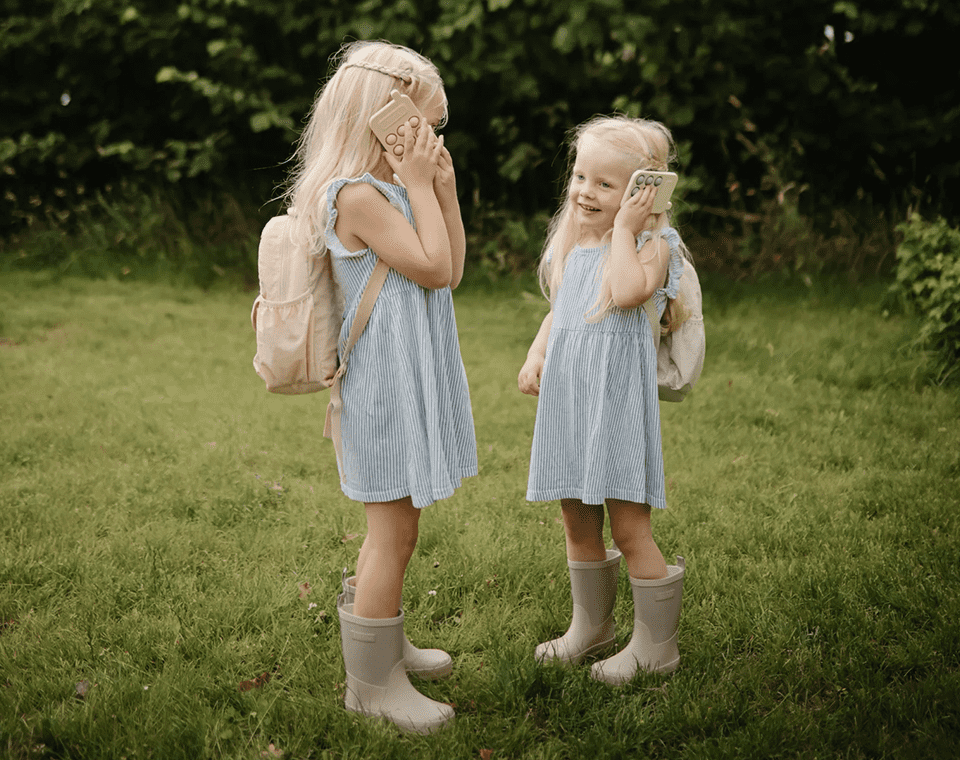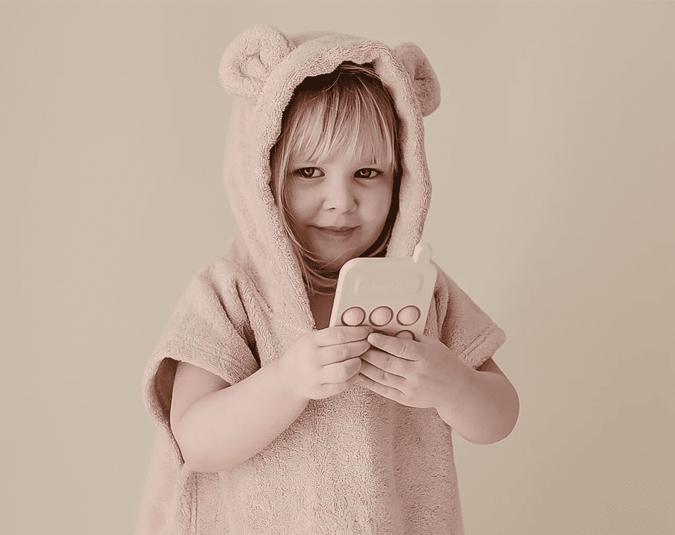 צעצוע לחיצה בצורת טלפון מבית מושי מיוצר תוך התחשבות בידיים קטנות מעודד חקר חושי ופיתוח מיומנות מוטוריקה עדינה עם עיצוב נקי וקלאסי בצבעים רכים