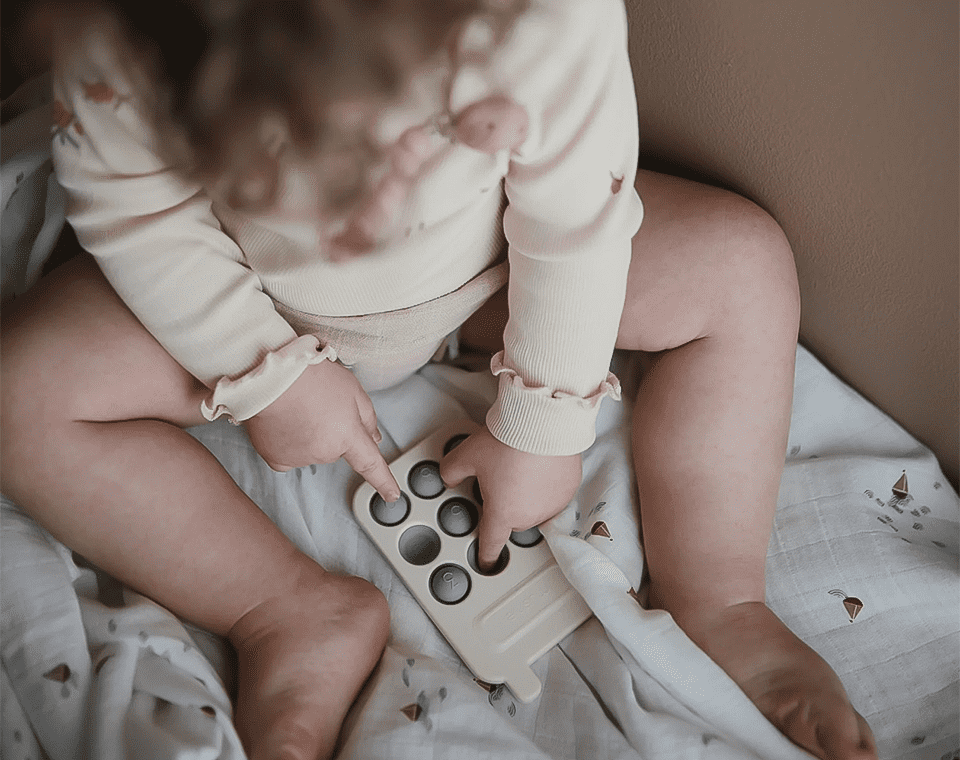צעצוע לחיצה בצורת טלפון מבית מושי מיוצר תוך התחשבות בידיים קטנות מעודד חקר חושי ופיתוח מיומנות מוטוריקה עדינה עם עיצוב נקי וקלאסי בצבעים רכים