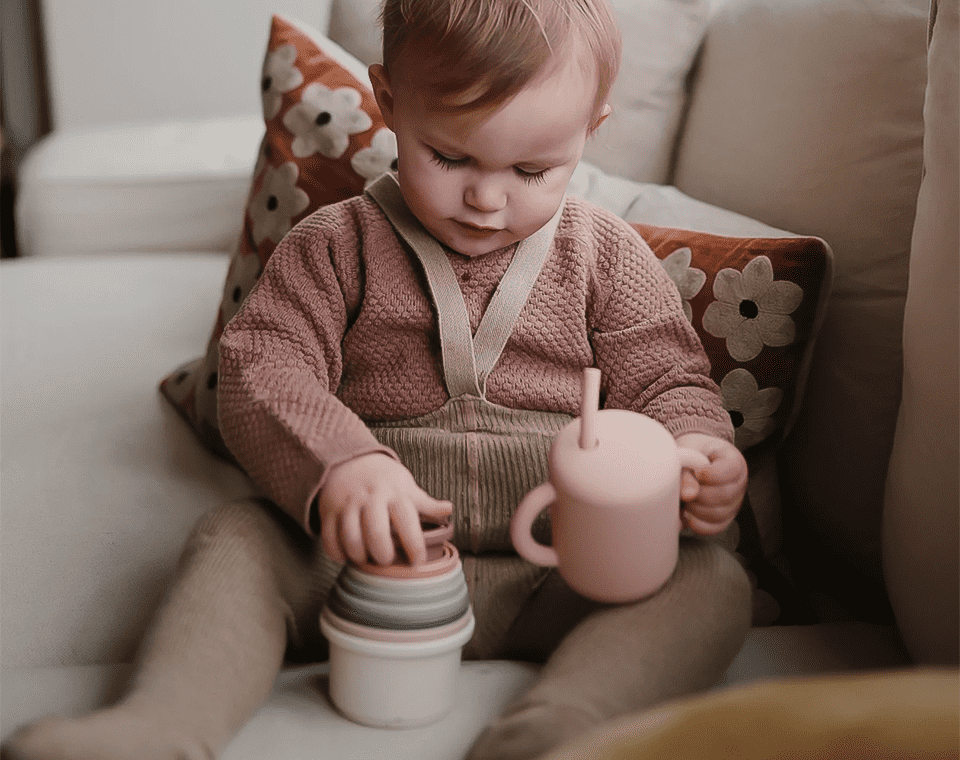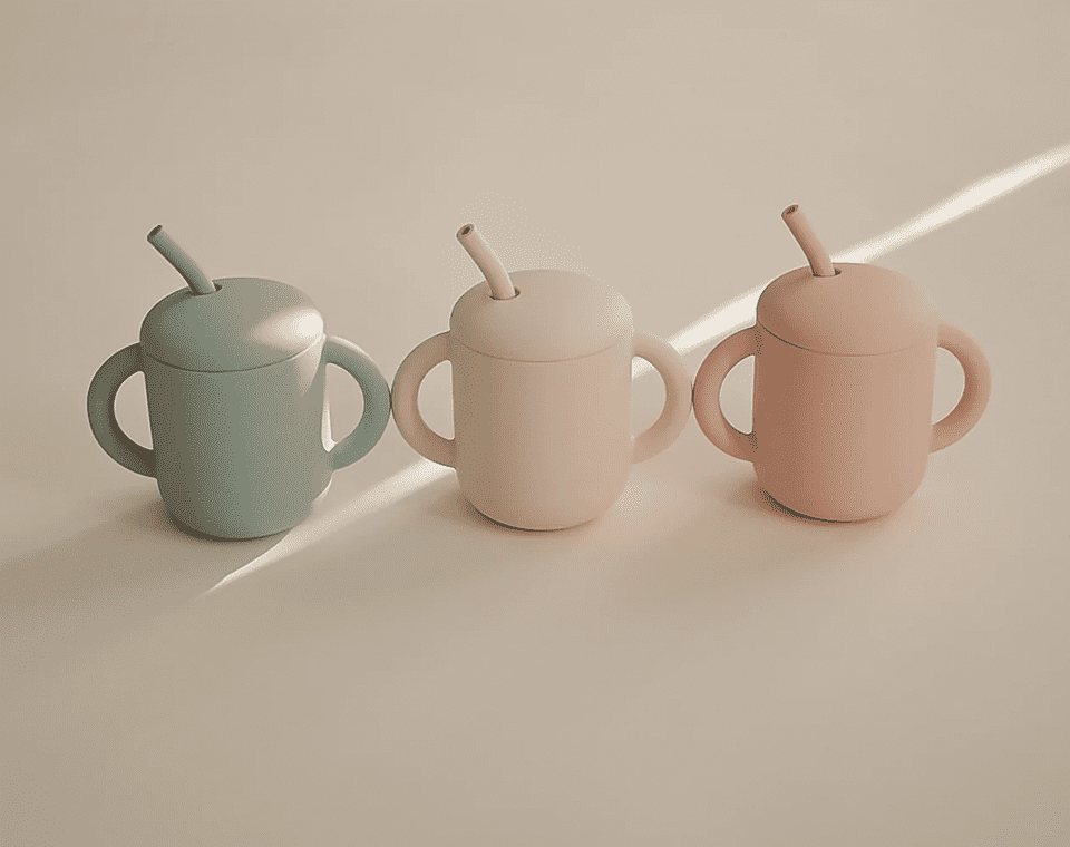 כוס השתייה של Mushie מגיעה עם מכסה נשלף וידיות אחיזה המותאמות לידיים הקטנטנות של ילדכם
