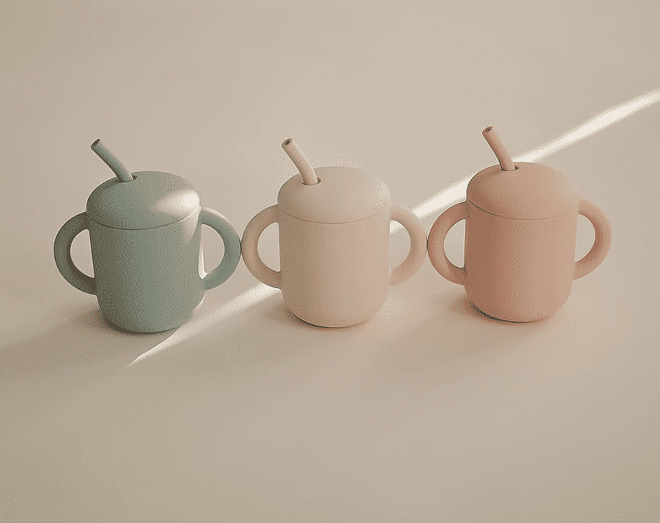 כוס השתייה של Mushie מגיעה עם מכסה נשלף וידיות אחיזה המותאמות לידיים הקטנטנות של ילדכם