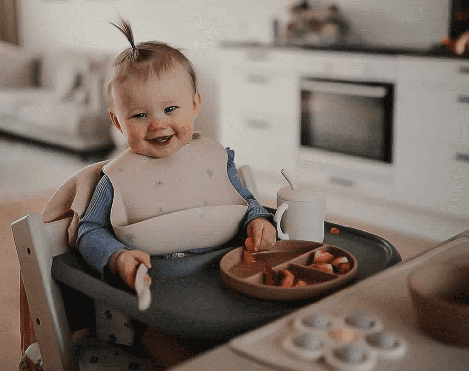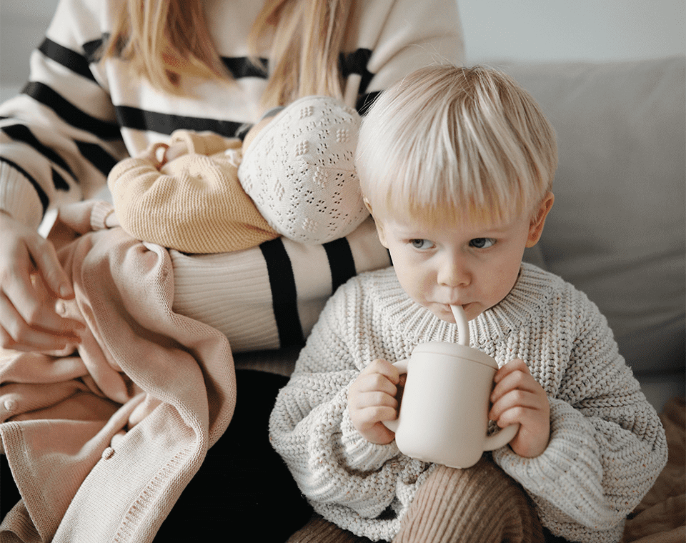כוס השתייה של Mushie מגיעה עם מכסה נשלף וידיות אחיזה המותאמות לידיים הקטנטנות של ילדכם