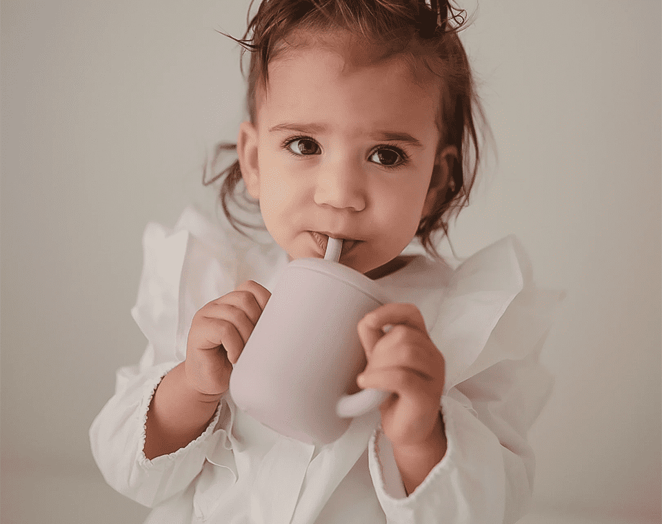 כוס השתייה של Mushie מגיעה עם מכסה נשלף וידיות אחיזה המותאמות לידיים הקטנטנות של ילדכם