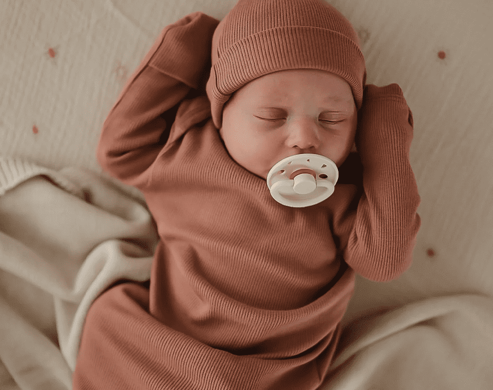 כובע ריב עם קשירה מבית MUSHIE, עשוי מכותנה אורגנית. מושלם כדי לחמם את האוזניים הקטנטנות של תינוקך