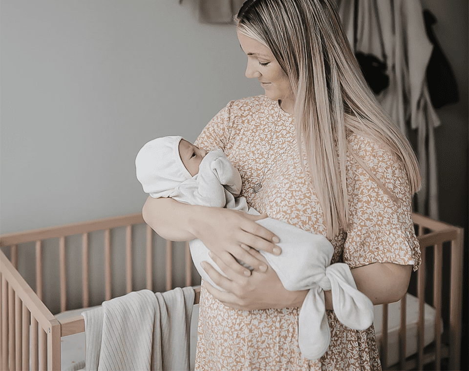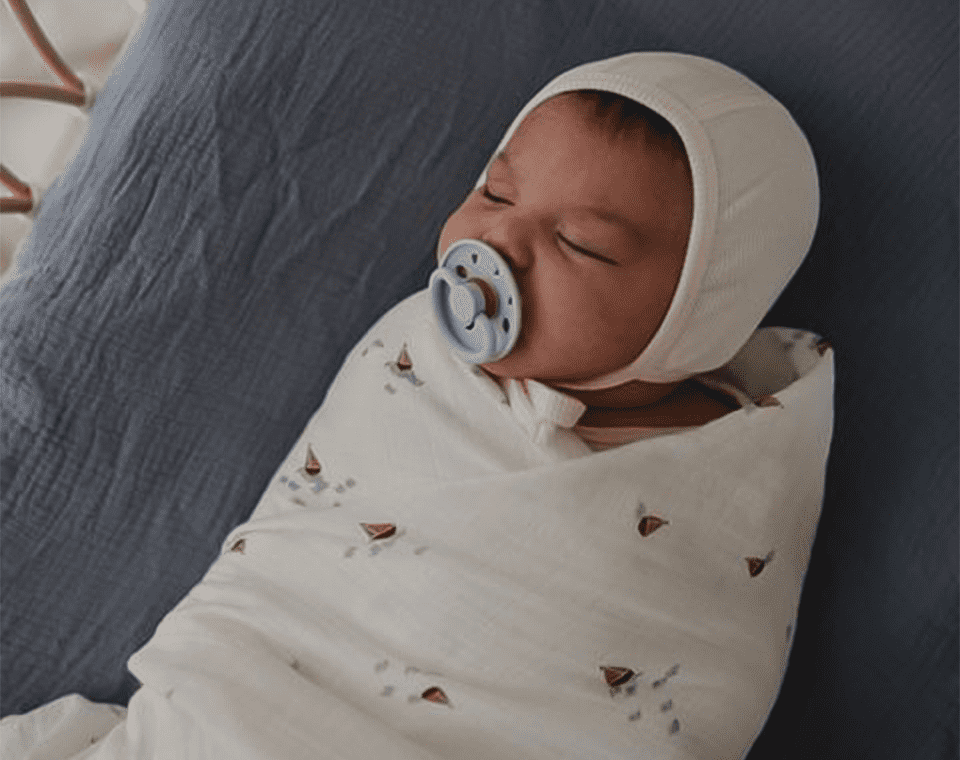 כובע בונט מבד ריב מבית Mushie עשוי מכותנה אורגנית, מכסה באופן מלא את האוזניים ומעניק חום ומקסימום נוחות