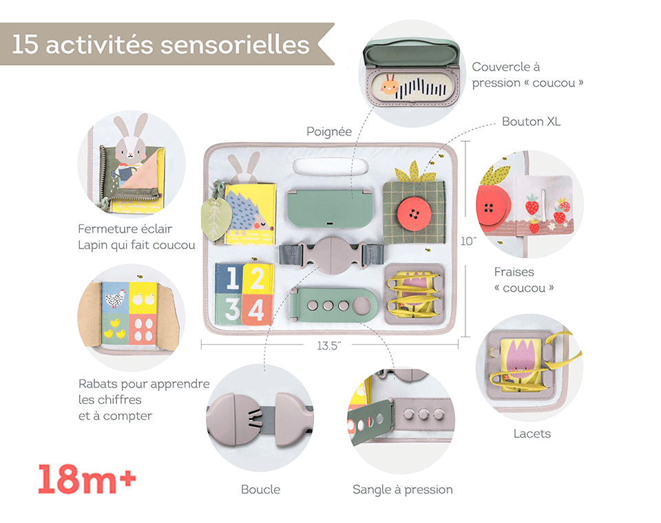1. פעילויות כוללות: רוכסן, כפתור XL, דש סקוטש, שרוכים, כיסוי הצמד, אבזם, רצועת משיכה, פעילויות הצצה, מספרים, כמויות וספירה. פעילויות אלו מעודדות מיומנויות מוטוריות עדינות, מיומנות פתרון בעיות ותיאום עין-יד. הצעצוע היחיד שתוכנן במיוחד לשלב ההתפתחות של פעוטות מגיל 18 חודשים ומעלה, שאינו מכיל חלקים קטנים ובטוח לפעוטות מתחת לגיל 3.