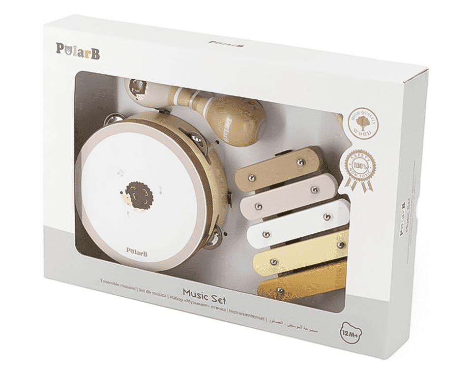 סט כלי נגינה 3 חלקים מעץ מבית ויגה Viga, הסט כולל קסילופון עם מקוש, טמבורין ומרקס מרשרש הכלים קלים לאחיזה ומעוצבים בצבעי פסטל עדינים