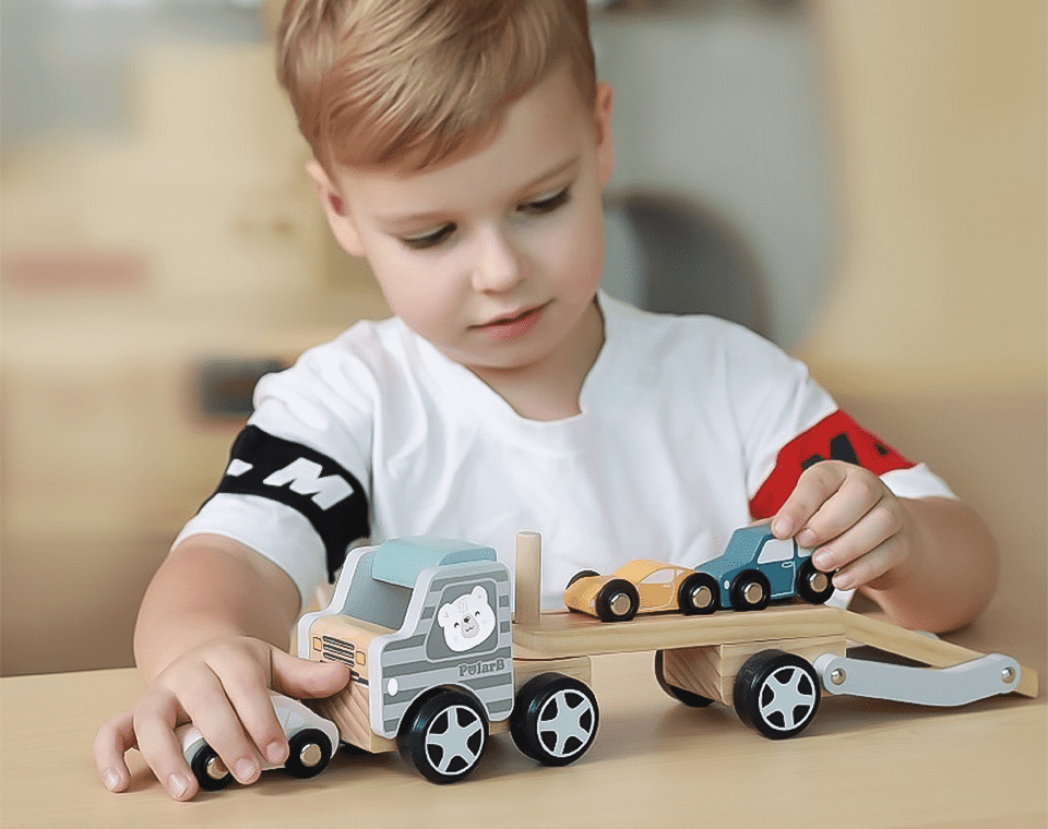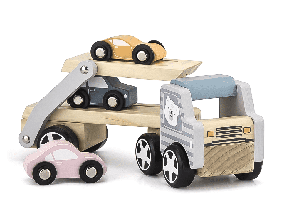 מוביל מכוניות מעץ מבית ויגה - משאית מובילה דו קומתי, מפתח מיומנויות מוטוריות, קשר עין יד, החלקים עשויים עץ איכותי ועמיד הצבוע בצבעים נטולי רעילים