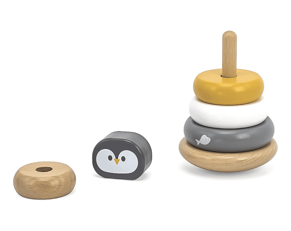 הסט כולל בסיס עם מוט, ארבעה טבעות וראש פינגווין, עשוי עץ מלא וצבוע בצבעים שאינם רעילים.