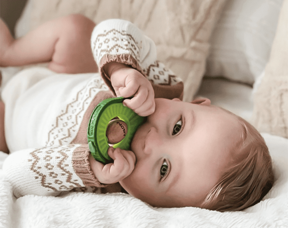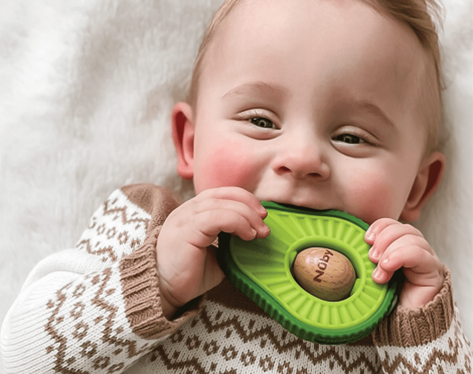 נשכן אבוקדו משולב סיליקון ועץ, בעל משטחי נשיכה מרובים וגלעין מסתובב מעודד מיומנויות מוטוריות עדינות.