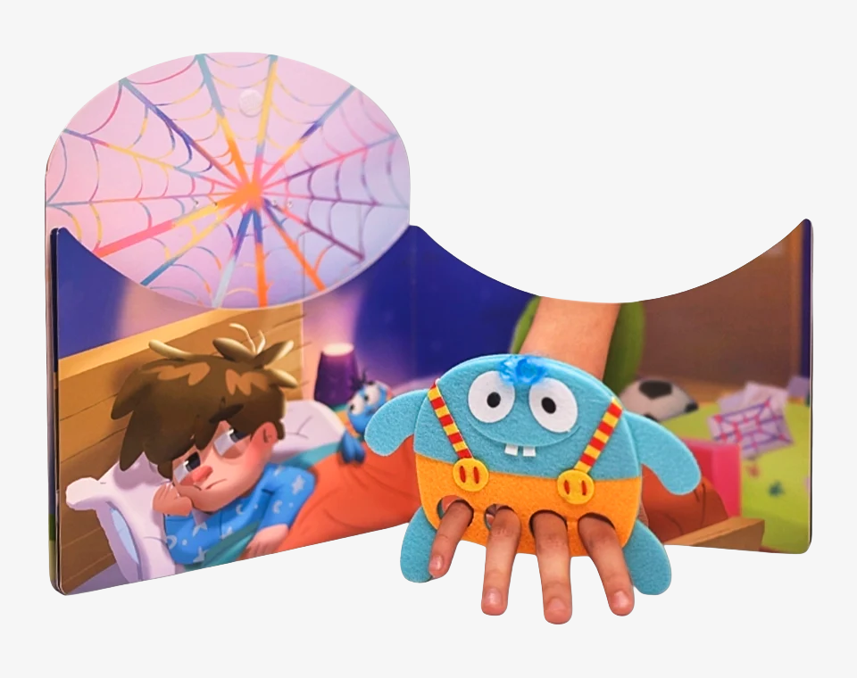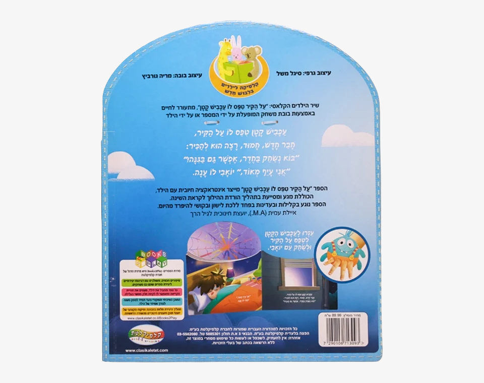שיר הילדים הקלאסי: ״ על הקיר טיפס לו עכביש קטן״, מתעורר לחיים באמצעות בובת משחק המופעלת על ידי המספר או על ידי הילד.
