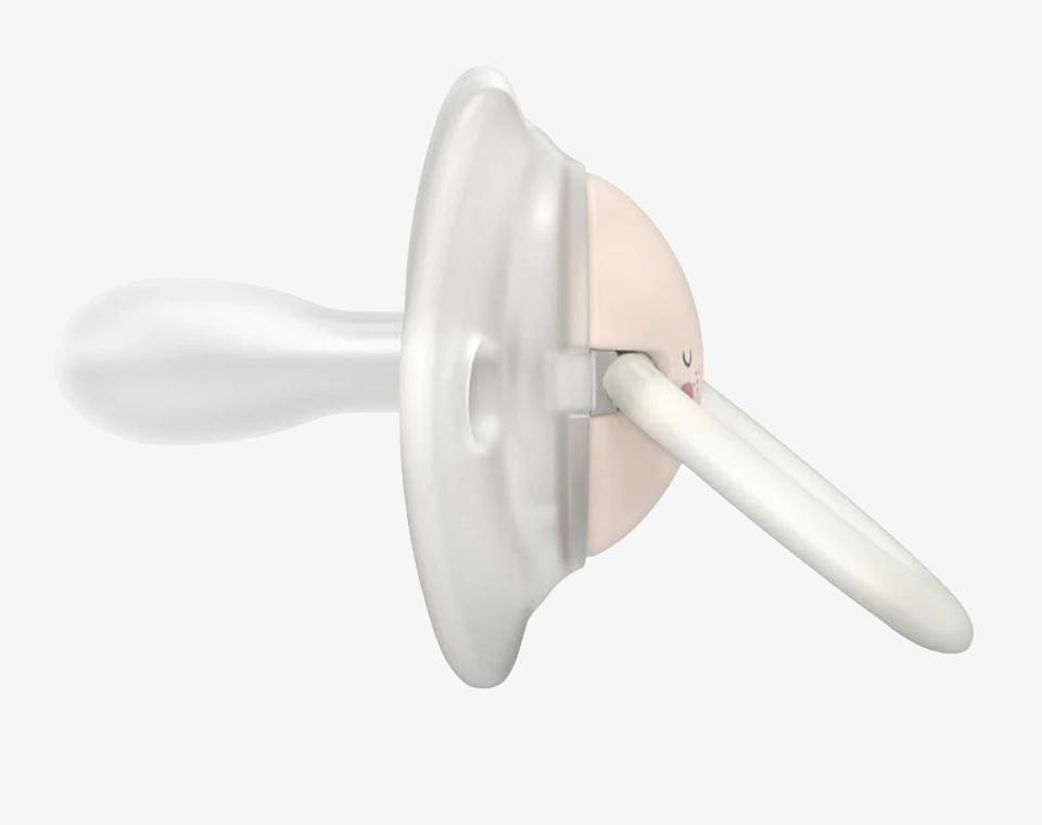 זוג מוצצי 6-18 מסדרת זוהרים בחושך עם איור ארנב ברקע ורוד ופטמת סליקון פיזיולוגית Sx Pro- שפותחה על ידי אורתודנטים ומומחים.