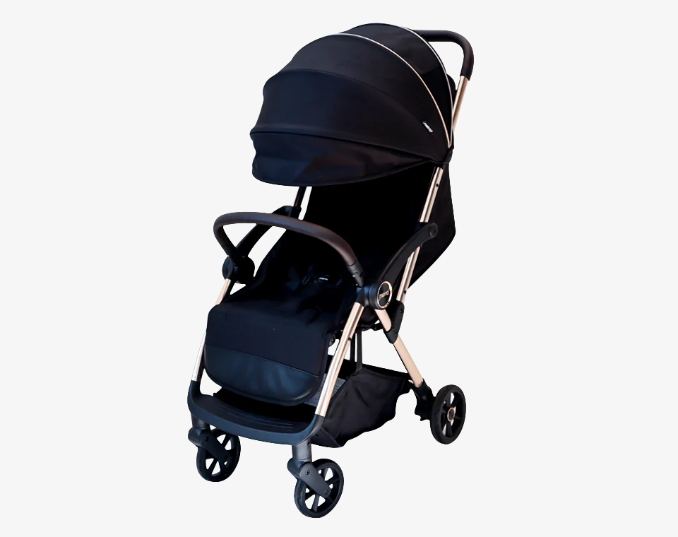 טיולון דגם Iggy מבית MOONA בצבע שחור עם שלד שמפניה וידיות עור בצבע חום כהה