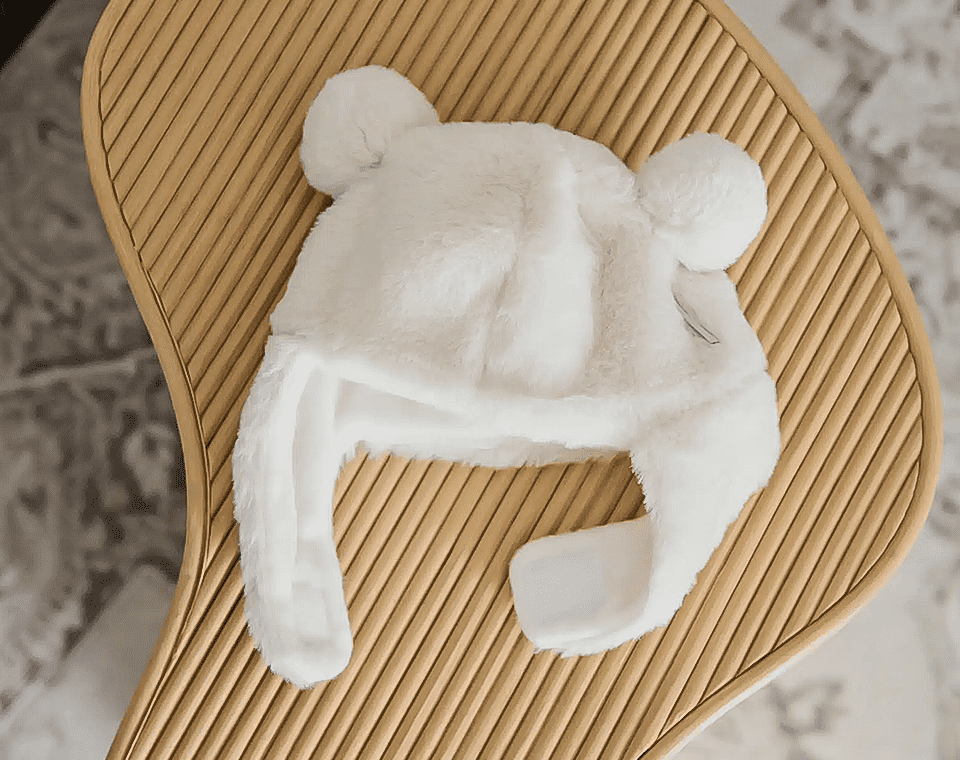 כובע פונפונים לתינוק המכסה את אזור האוזניים ובעל בטנת פליז מחממת.