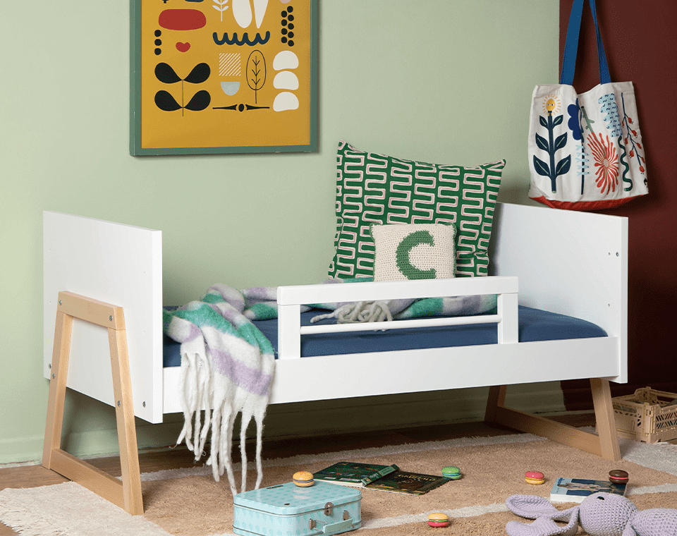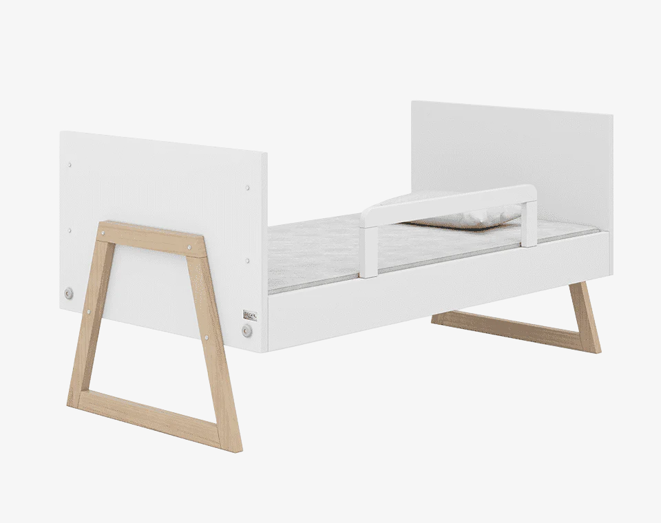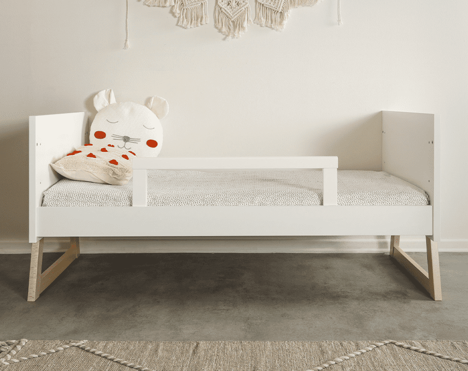 מיטה מודרנית עשויה עץ מלא, עם 3 גבהים למזרן ואפשרות להפיכה למיטת מעבר (ברכישת מעקה טודלר נפרד) מעוצבת, בטוחה ומתאימה לאורך זמן.