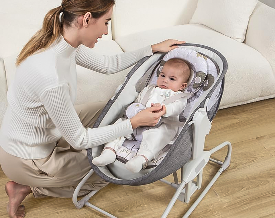 נדנדה רב תכליתית 4ב1 מבית מסטלה משמש כעריסה, כסא מתנדנד, כסא יציבה וטרמפולינה.