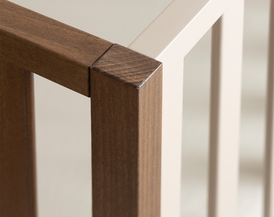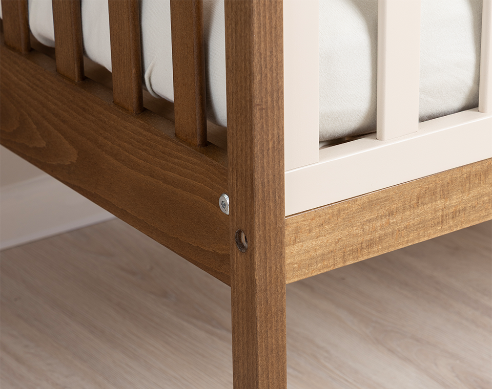 מיטה עשויה עץ בוק איטלקי מלא ואיכותי, בגוון חלב שקדים עם גימור עץ אגוז טבעי. השילוב הנעים בין הצבעים הקלאסיים מתאים לבנים ולבנות כאחד ומשתלב בקלות בכל עיצוב חדר. המיטה מתאימה מגיל לידה ועד לגיל פעוטות – וניתנת להפיכה למיטת מעבר עם הוספת מעקה טודלר (נמכר בנפרד).