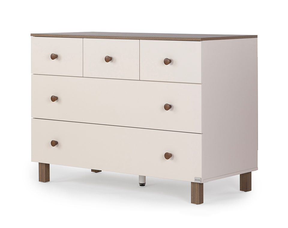 שידה רחבה במיוחד בגוון חלב שקדים עם ידיות ורגליים מעץ מלא, הכוללת 6 מגירות עמוקות לאחסון בגדי תינוק, חיתולים, מצעים וכל מה שצריך שיהיה נגיש ומסודר. גוף השידה עשוי MDF איכותי ומחוזק במוט פלדה פנימי, לניצול מקסימלי של השידה לאורך שנים. בזכות העיצוב הניטרלי – השידה מתאימה גם לחדר פעוטות וילדים.