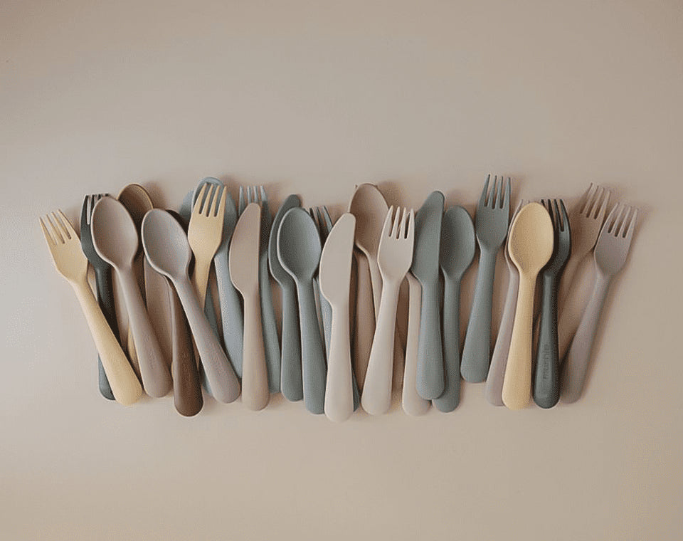 סט סכו״ם לתינוקות וילדים מבית Mushie – בעיצוב נקי ונעים, מותאם לידיים קטנות, עשוי חומרים בטוחים ומתאים לשטיפה במדיח.
