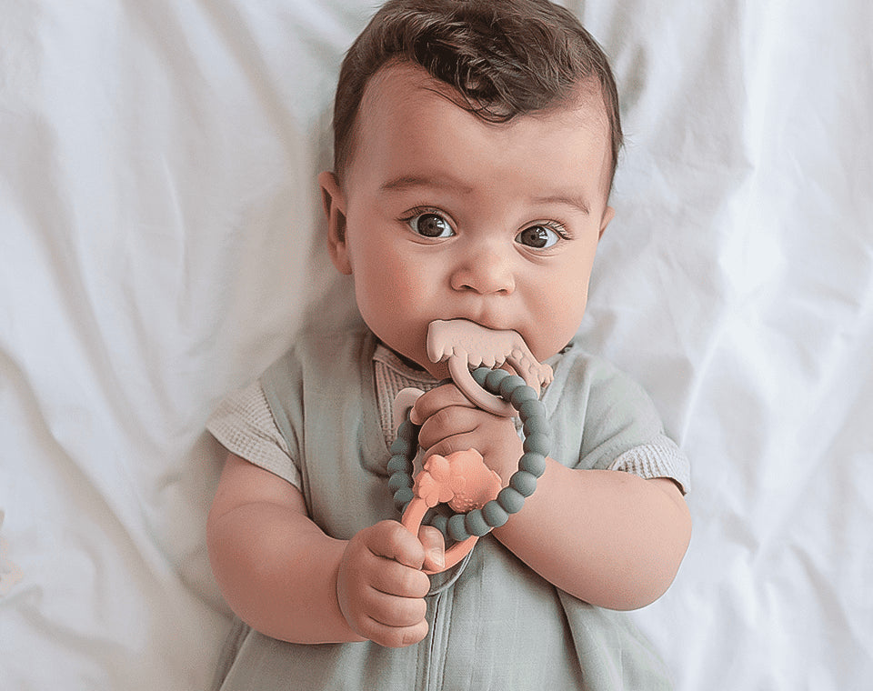 שלושה דינוזאורים חמודים על טבעת סיליקון רכה עם טקסטורת עלים מרגיעה – מושלם להקלה על כאבי חניכיים ולעידוד ההתפתחות החושית. בטוח, גמיש ונוח לאחיזה.