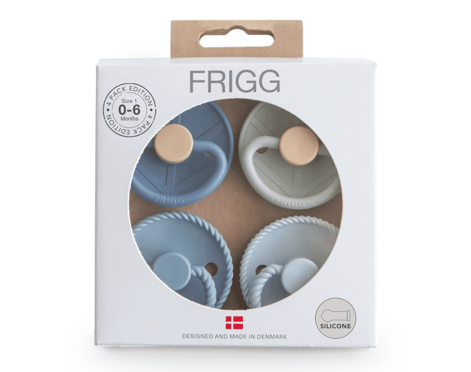 המארז כולל ארבעה מוצצים מסדרת הסיליקון של FRIGG – פטמת סיליקון עגולה סימטרית.