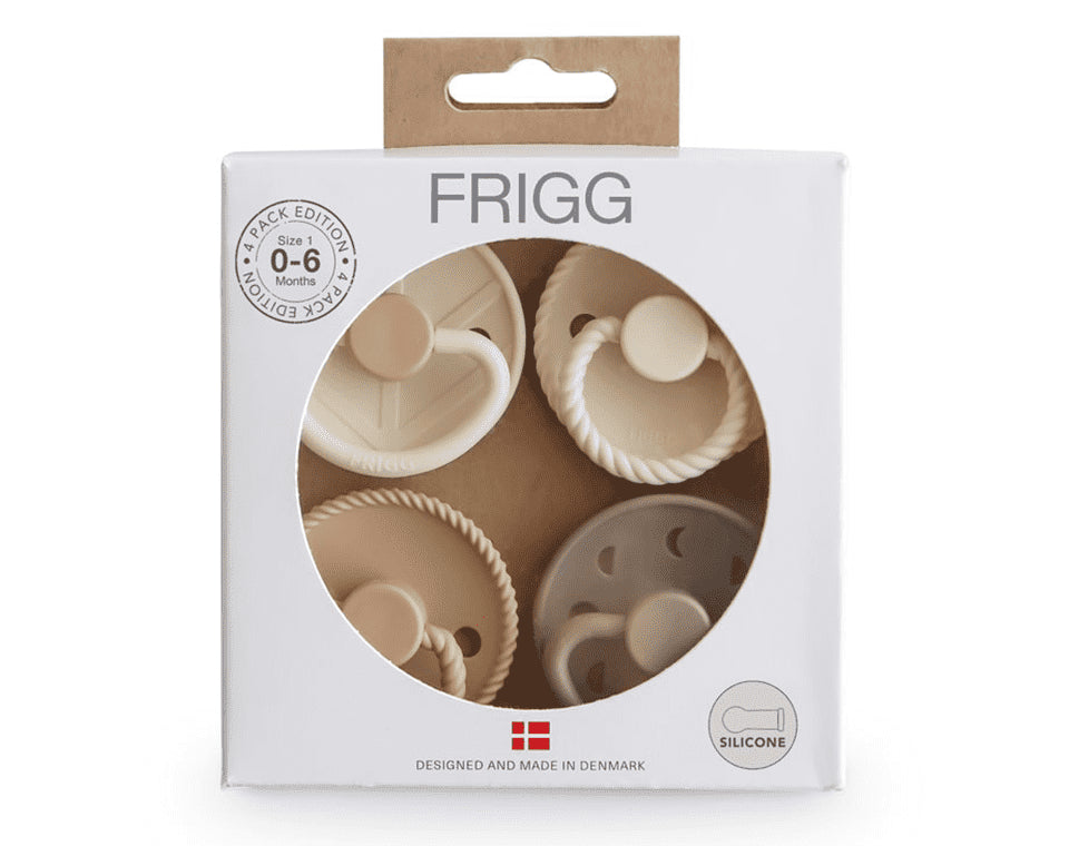 המארז כולל ארבעה מוצצים מסדרת הסיליקון של FRIGG – פטמת סיליקון עגולה סימטרית.