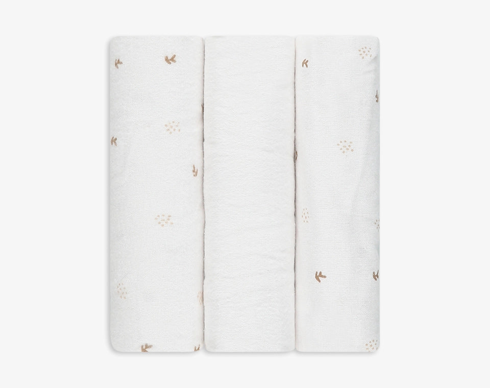 שלישיית חיתולי פלנל רכים ונעימים בגודל 76x76, עשויים 100 אחוז כותנה.