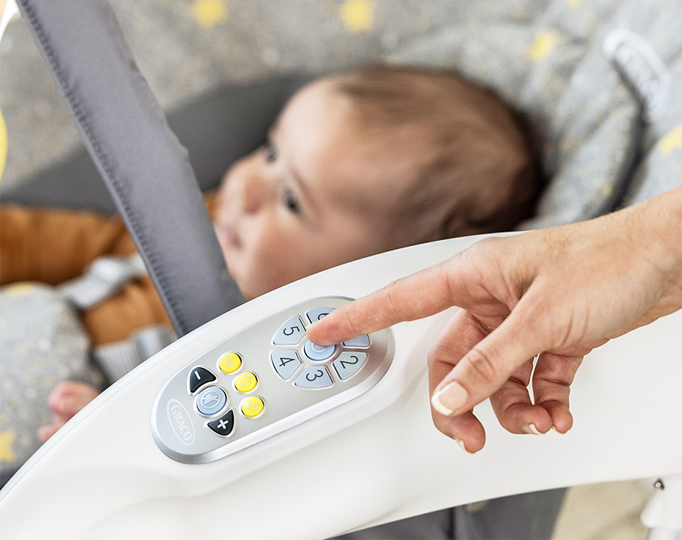 נדנדת תינוק מבית גרקו Graco קלה וניידת ,המתאימה מגיל לידה ועד 9 ק"ג/ גיל חצי שנה בעלת 6 מהיריות שונות.
