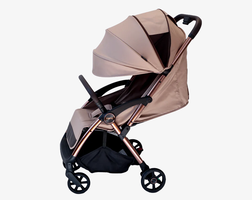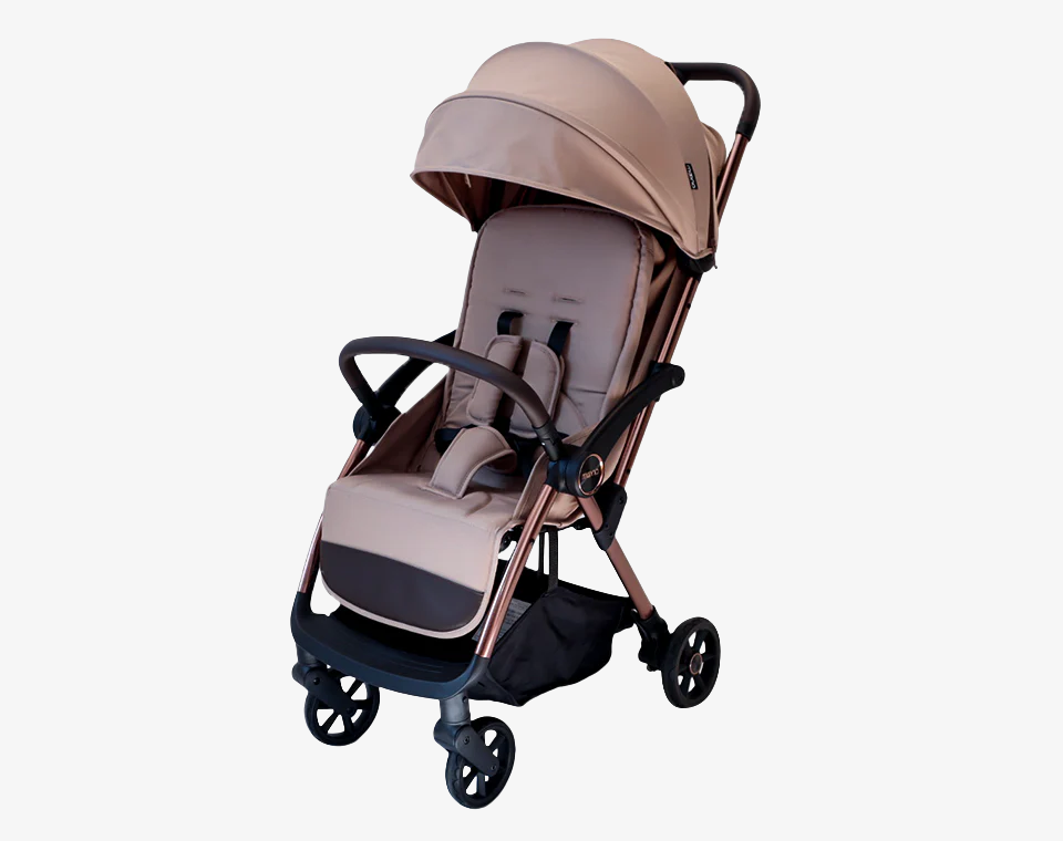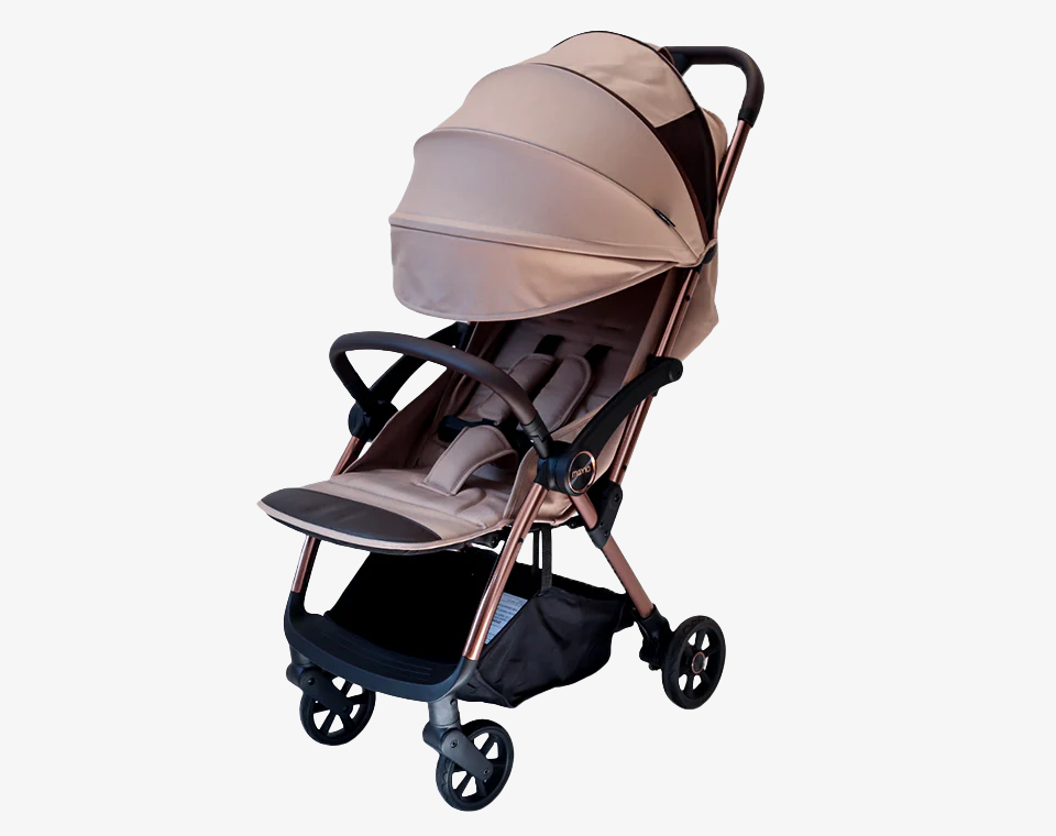 טיולון דגם Iggy מבית MOONA בצבע טופי עם שלד שמפניה וידיות עור בצבע חום כהה
