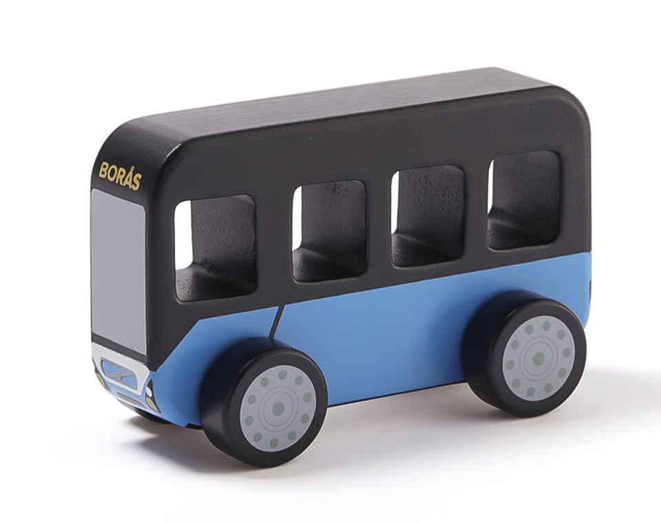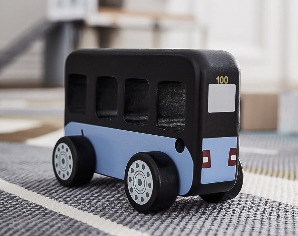 אוטובוס עירוני מעץ כולל חור קטן למיכל גז, כחלק מקולקציית הצעצועים AIDEN.