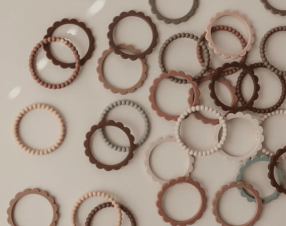 הצמידים היפים האלה יכולים לשמש גם את האם וגם את התינוק. לבשו אותם כאביזר ושמרו את הנשכנים המרגיעים בקרבת מקום כאשר התינוק זקוק להם עבור החניכיים המגורות