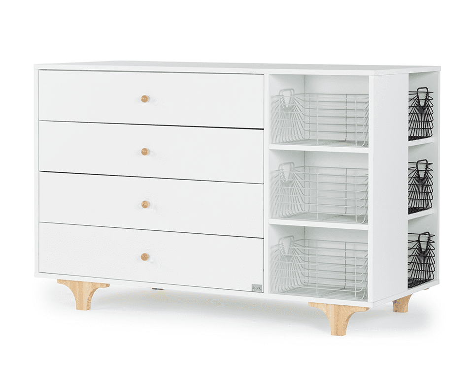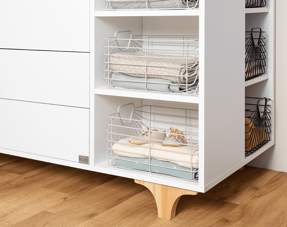 שידה לתינוק Julie ברוחב 140 ס"מ המשלבת את עקרון הפשטות המושלמת עם רגליים מעוגלות שיוצרות עיצוב אינטליגנטי עם סטייל. השידה מעניקה נוכחות אסתטית מרשימה הודות לשילוב עיצובי של תאים פתוחים בשתי פאות : קדמי ובצד השידה וכן אחסון סגור ב 3 מגירות גדולות. השידה כוללת 3 סלסלות בצבע לבן בהם ניתן לאחסן מוצרים של הבייבי בשלב הראשוני, ואחר כך תאים אלה יכולים לשמש אחסון למשחקים וספרים, לבייבי שגדל. הודות לעיצובה ניתן להשתמש בה במשך שנים רבות.